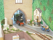 Nachdem ich das Gleisfeld des BW mit Schalltrittdämmung "asphaltiert" hatte, wurden der zweiständige Lokschuppen mit Nebenbau und Tankplatz gebastelt. Dafür hatte ich noch Teile von Bruder-Gebäuden und sonstige Reste übrig. Das dritte Gleis führt durch ein Tor auf des Betriebsgelände. Zu einem späteren Zeitpunkt will ich das Bild noch mittels meiner bescheidenen Malerei perspektifisch gestalten.